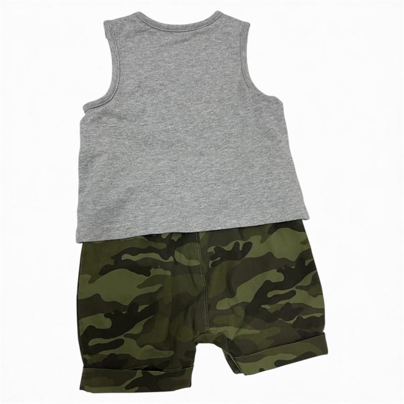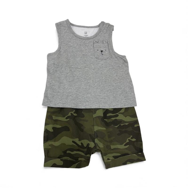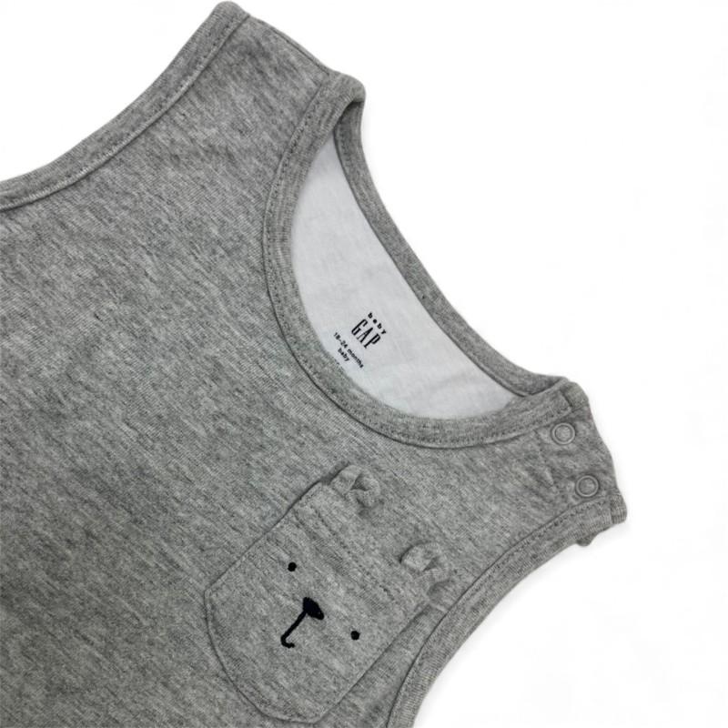 Macacão infantil da GAP, modelo sem mangas, com parte superior em algodão cinza e bolso frontal bordado com um rostinho delicado. A parte inferior traz estampa camuflada em tons de verde. Peça leve, confortável e prática para o dia a dia.