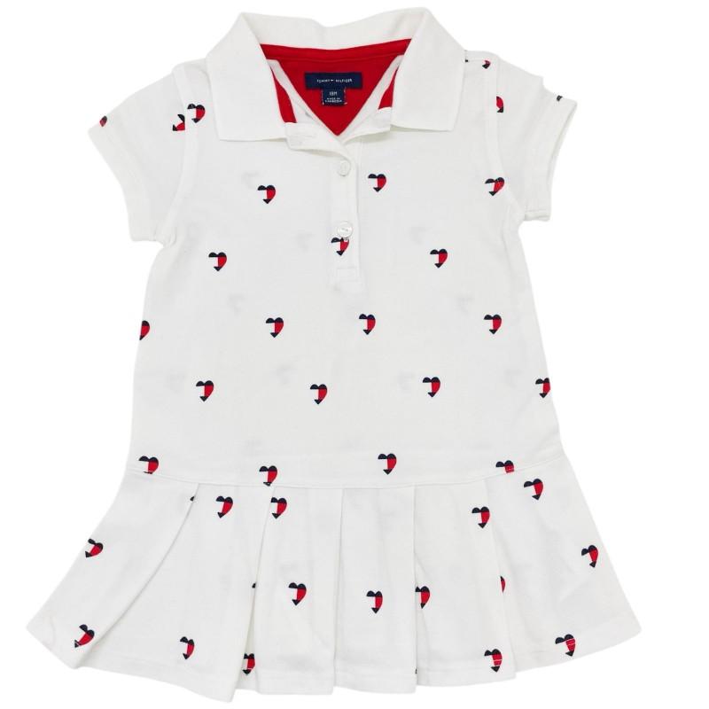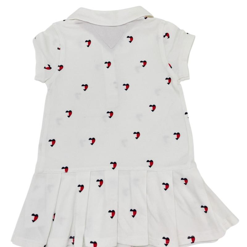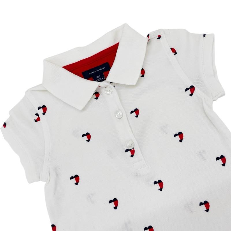 Charmoso vestido polo branco com estampa de corações em vermelho e azul, cheio de estilo e conforto.