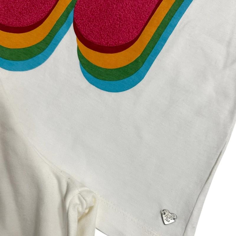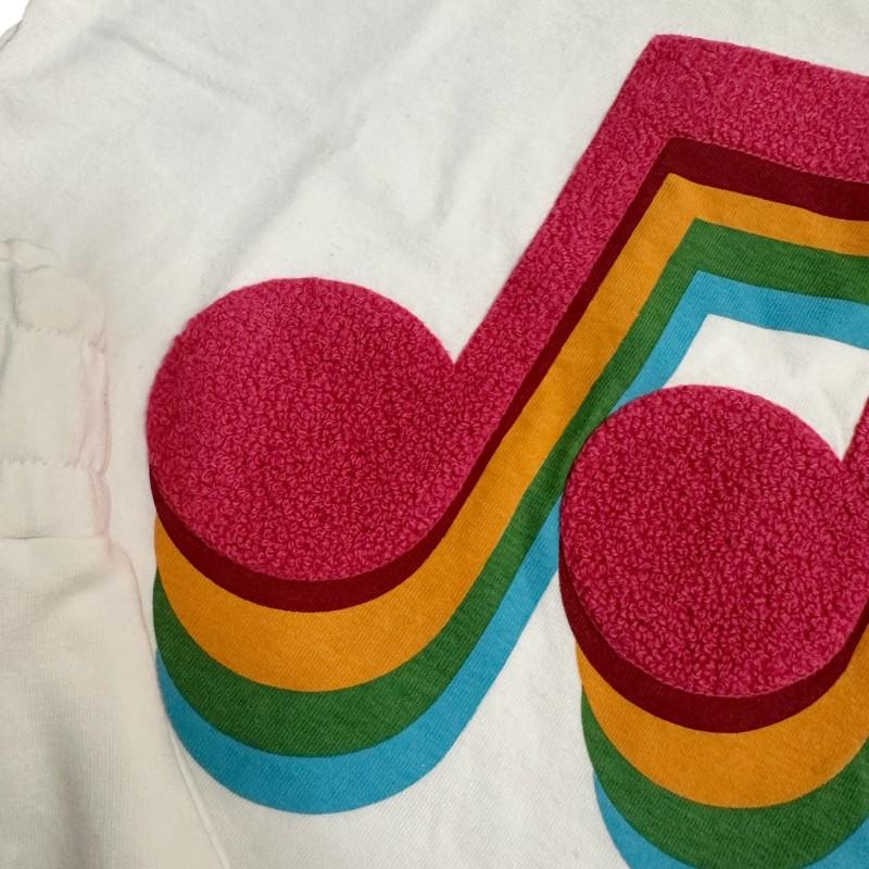 A blusa em malha leve na cor off-white possui modelagem confortável e manga curta, ideal para o verão. O destaque fica por conta da estampa frontal em formato de nota musical com efeito em relevo, combinando cores vibrantes em camadas que trazem um visual alegre e divertido à peça.