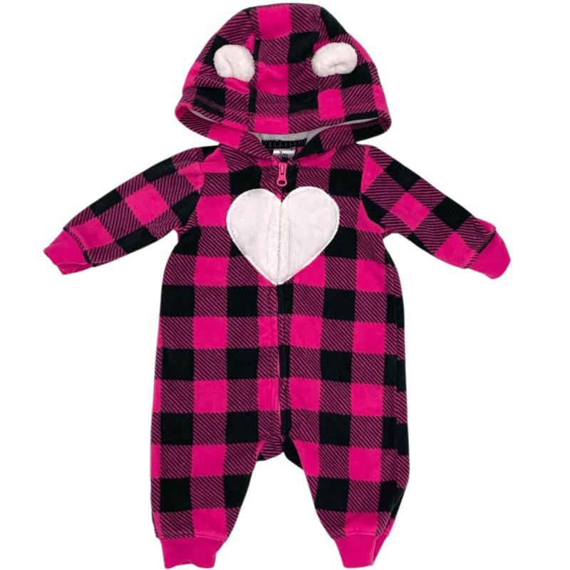 O design em xadrez rosa e preto dá um charme especial à peça, enquanto o coração peluciado na parte frontal adiciona ainda mais fofura. O capuz possui orelhinhas aplicadas, deixando o look irresistível. O fechamento frontal em zíper facilita muito vestir e trocar o bebê.