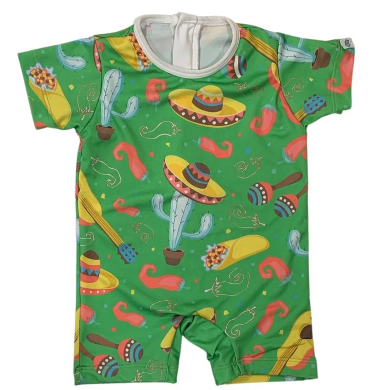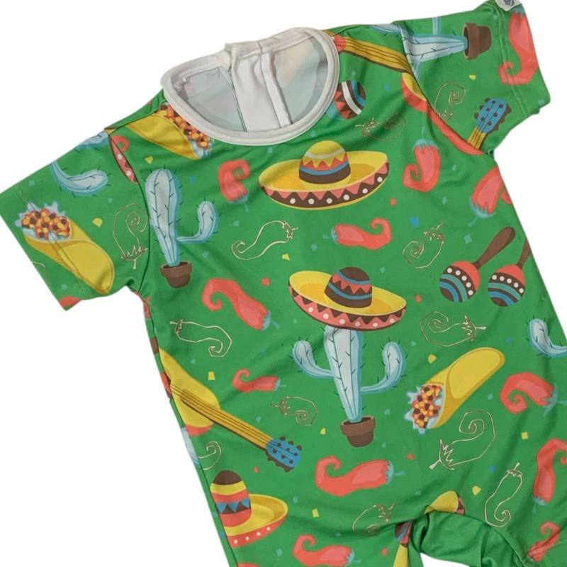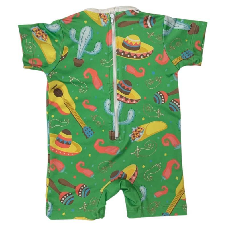 Cheio de cor e diversão, este macaquinho de moda praia é a escolha perfeita para acompanhar os pequenos nos dias de sol com muito estilo e conforto. Com estampa temática superanimada, trazendo elementos como cactos, sombreros, guitarras, maracas, pimentas e tacos, ele tem um visual alegre que destaca a personalidade da criança.