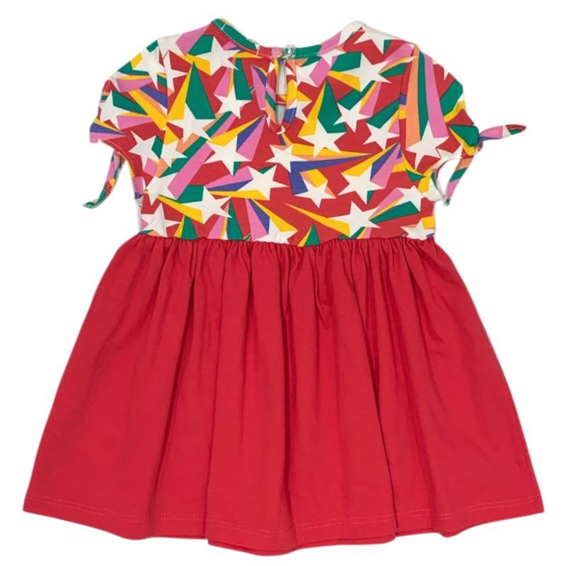 Um vestidinho cheio de personalidade e charme! A peça traz uma parte superior vibrante, com estampa colorida de estrelas geométricas, combinando tons intensos como rosa, verde, amarelo e lilás. As manguinhas contam com delicados lacinhos laterais, deixando o visual ainda mais fofinho.
