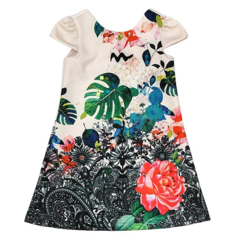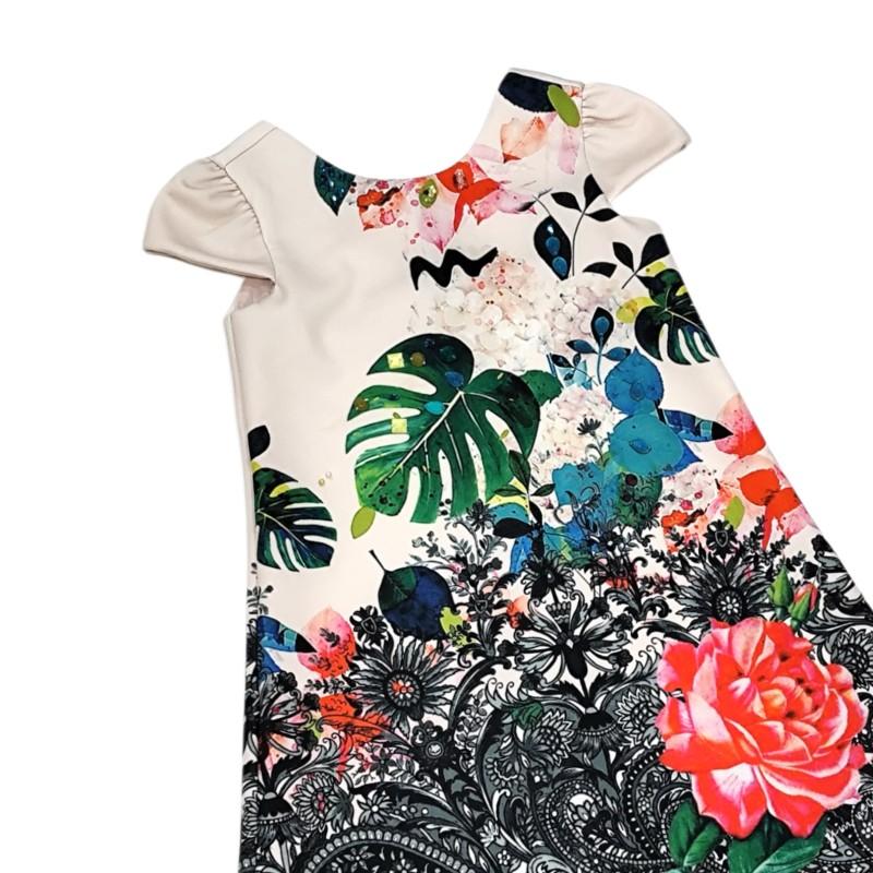 Encanto por todos os lados! Este vestido da marca Um Mais Um traz uma estampa marcante e super colorida, combinando flores, folhagens tropicais e detalhes artísticos que deixam a peça única e cheia de personalidade. O mix de cores vivas sobre o fundo claro cria um visual moderno, alegre e perfeito para qualquer ocasião.