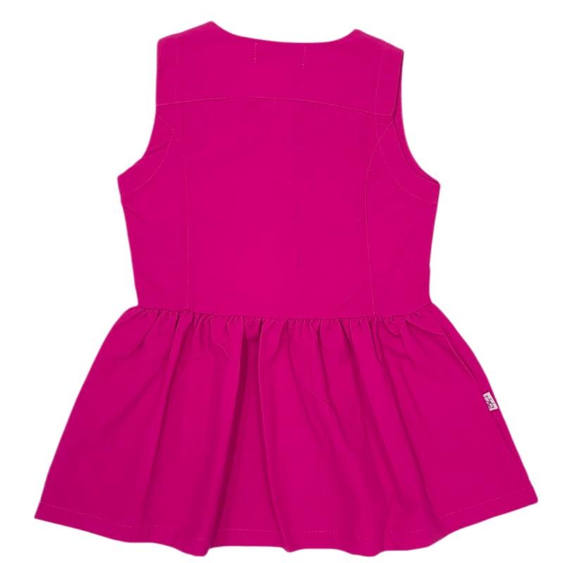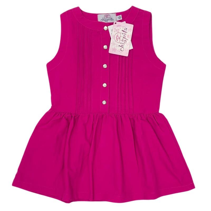 Em um vibrante tom de rosa, o modelo possui design sem mangas, gola redonda e detalhes em pregas na parte frontal, finalizados com botões decorativos que acrescentam charme extra. A saia levemente franzida traz movimento e delicadeza, ideal para ocasiões especiais ou para o dia a dia com muito estilo.