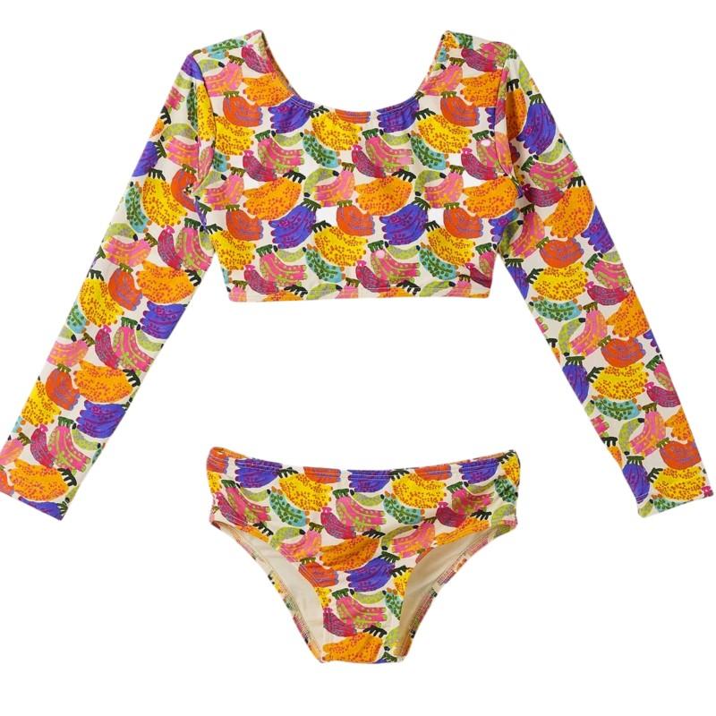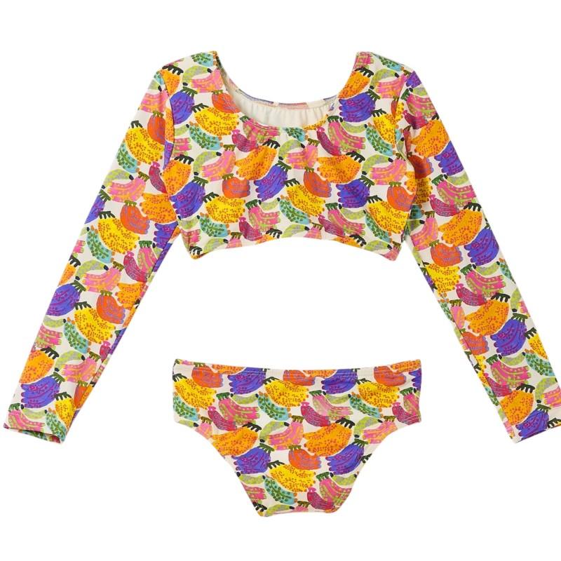 Biquíni infantil com decote em U e mangas longas e estampado. Para maior conforto das crianças vem com forro e mistura de elastano.