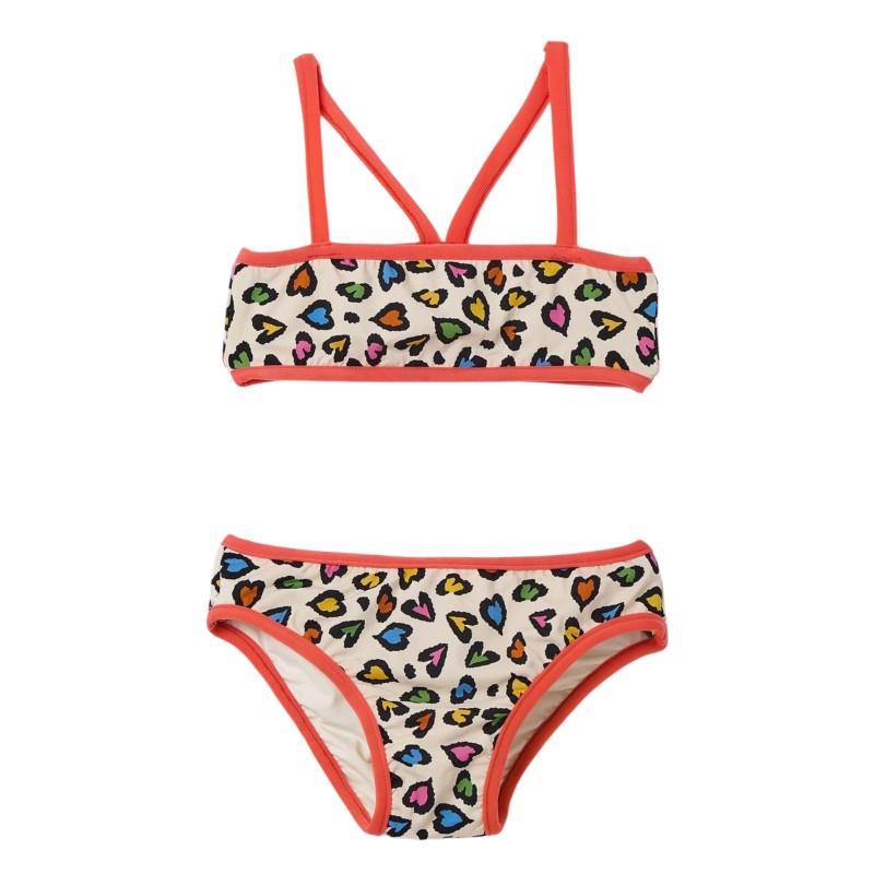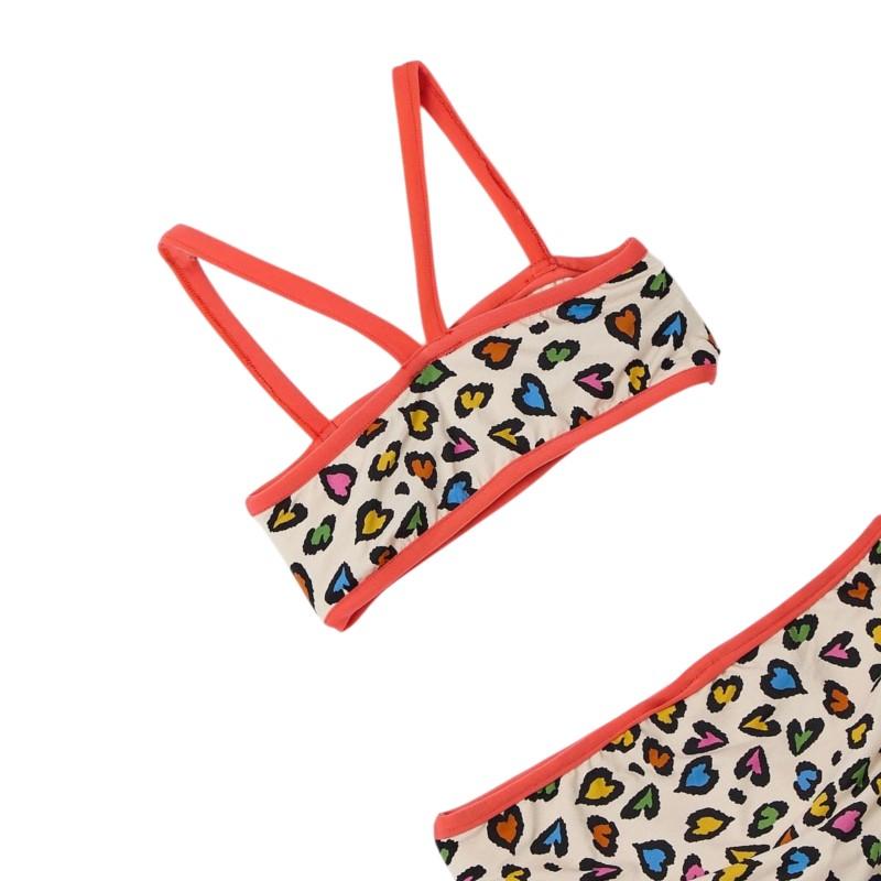 Biquíni infantil estampado com forro, mistura de elastano para priorizar o conforto, top com decote reto, alças e vivo em tom vibrante nos acabamentos.
