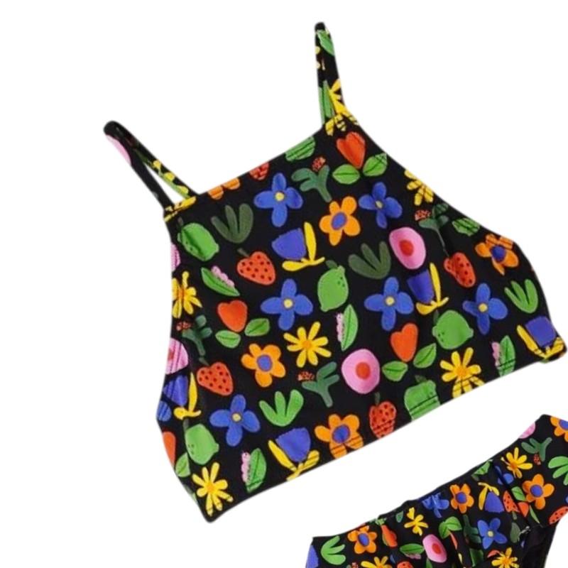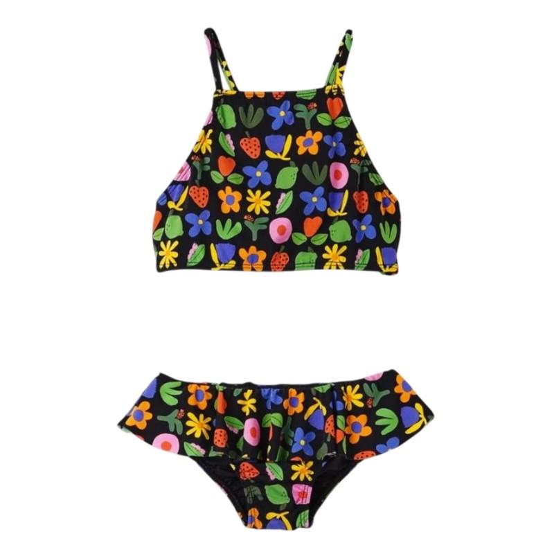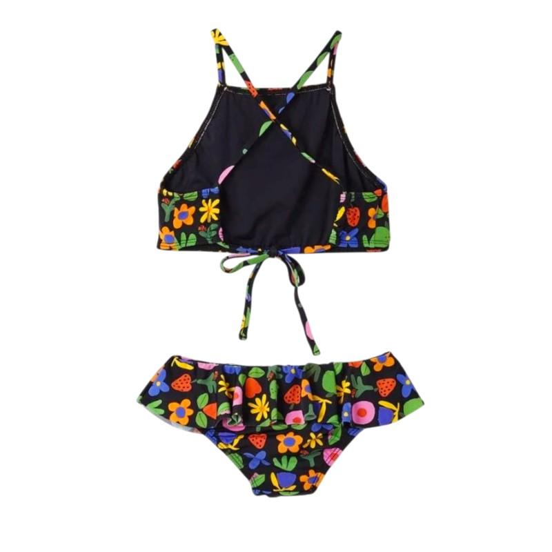 Biquíni infantil estampado com forro, mistura de elastano para priorizar o conforto, top com decote reto, alças com amarração regulável nas costas e babado na cintura da calcinha.