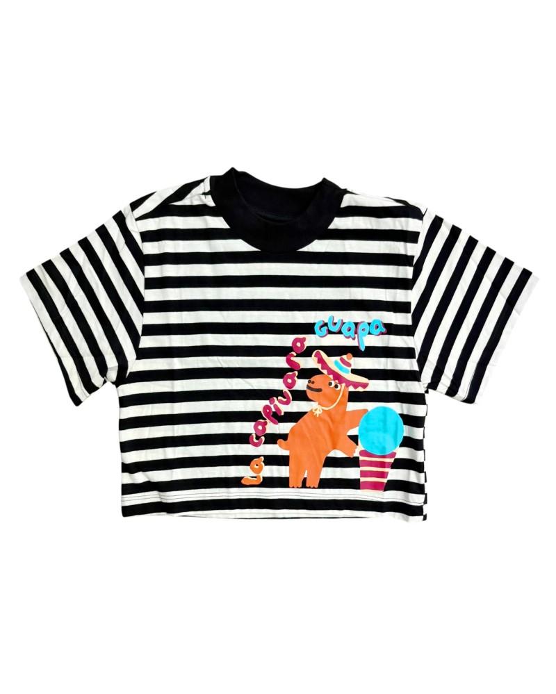 Blusa infantil listrada desenvolvida em tecido 100% algodão com mangas curtas, vivo canelado no decote redondo.