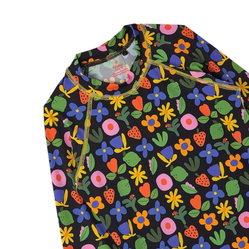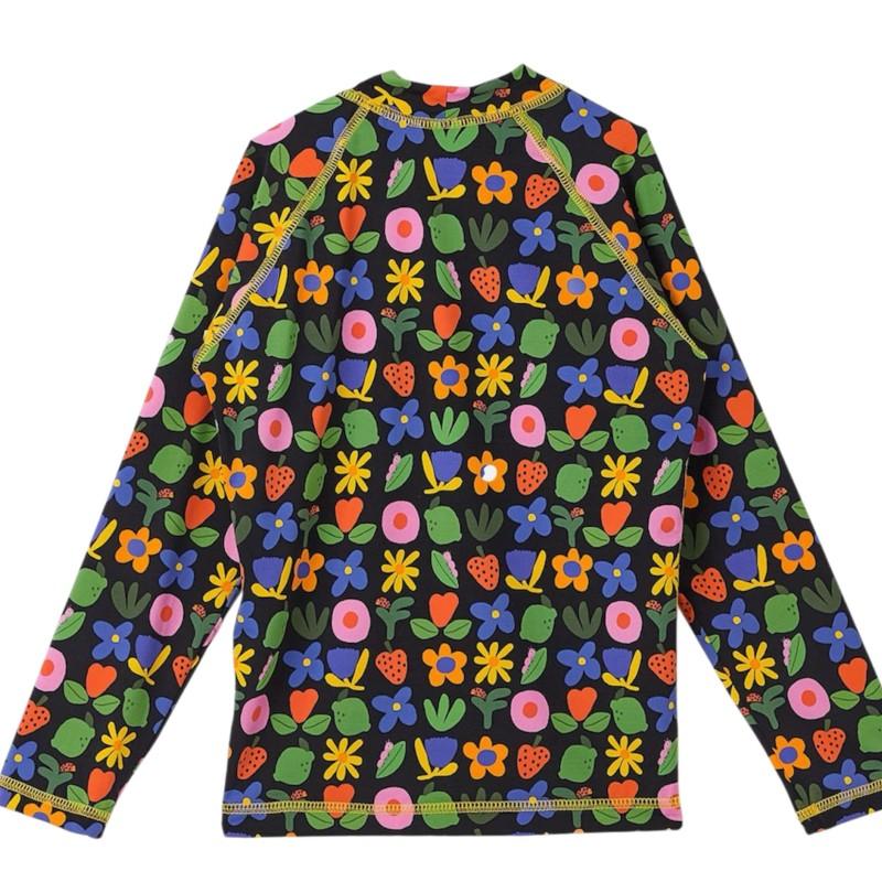 Camiseta infantil estampada, com proteção UV, mangas longas, decote redondo, mistura de elastano para priorizar o conforto e detalhe de pespontos em cor vibrante.