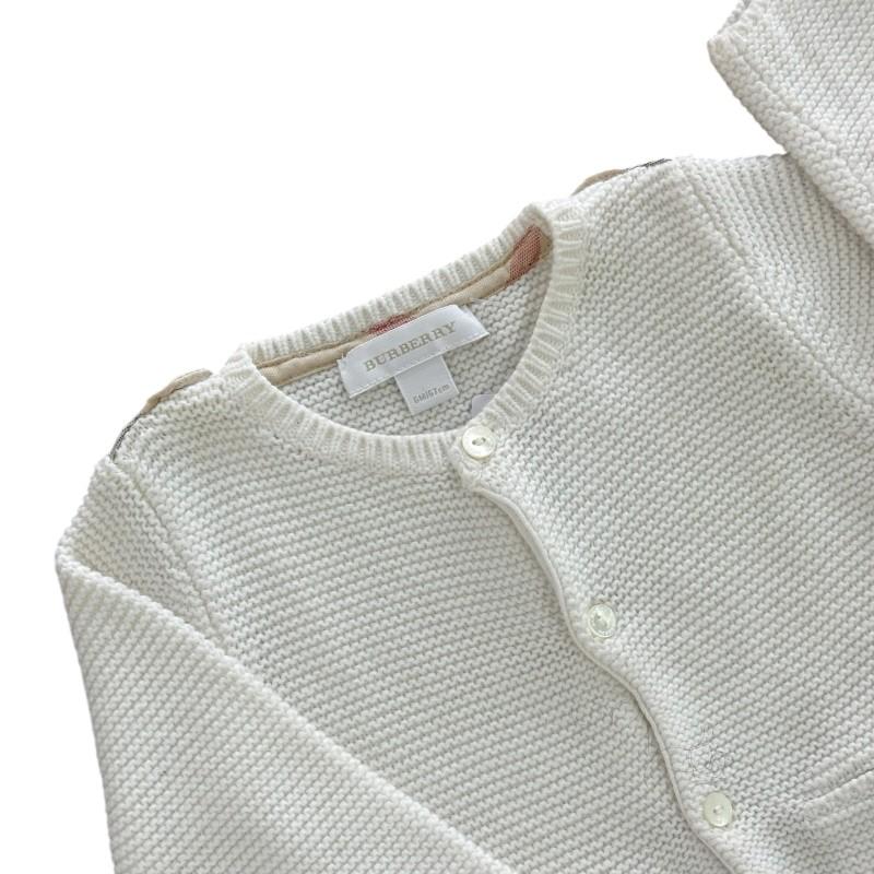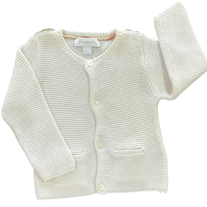 Casaco cardigan branco da Burberry, tamanho 6 meses. Confeccionado com material macio e confortável, este casaco oferece aquecimento e sofisticação para os pequenos. Com design clássico da marca, é perfeito para complementar looks elegantes, proporcionando conforto e estilo nos dias mais frescos.