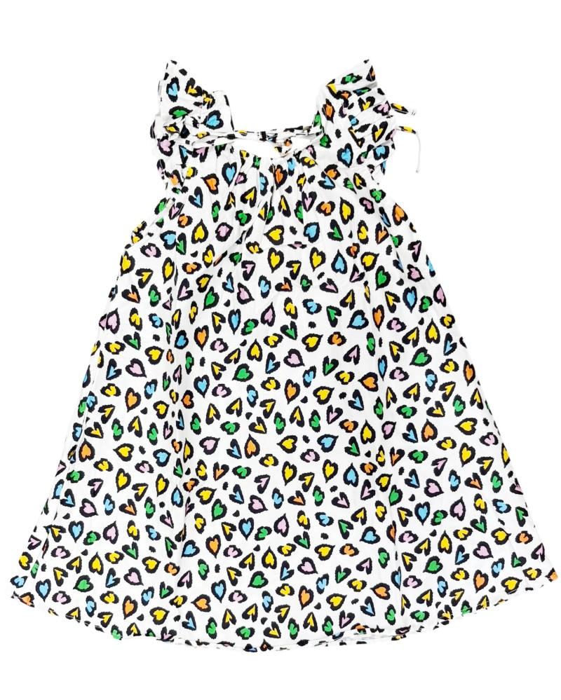 Vestido infantil desenvolvido em tecido 100% algodão com decote em U, babado nas alças, recorte com regulagem por amarração nas costas e os desenhos da estampa.