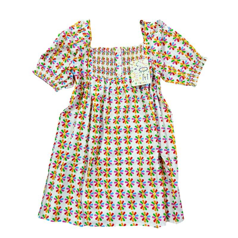 Vestido de manga curta colorido da Fábula, tamanho 6 anos, 100% algodão. Com uma estampa vibrante e tecido leve, esse vestido é perfeito para os dias quentes, oferecendo conforto e estilo. Ideal para ocasiões casuais, ele traz um visual alegre e cheio de charme.