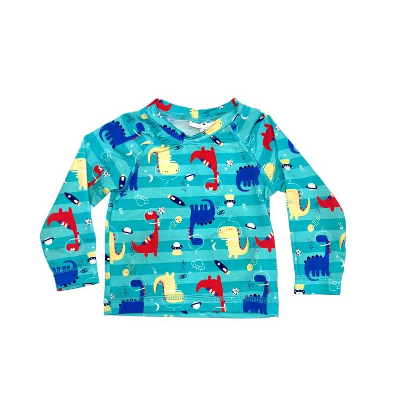 Camiseta UV divertida cheia de estampas lindas de dinossauros,otima para um dia de praia ou piscina,garantindo seguranca conforto.