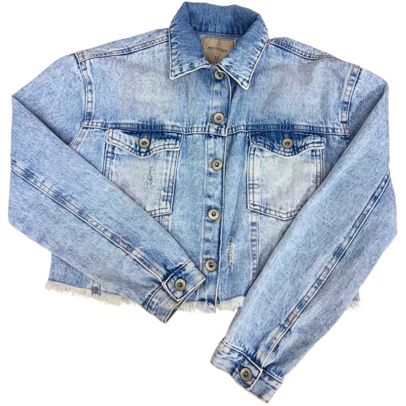 Jaqueta Jeans Infantil Miss Fifteen Azul Claro – Barra Desfiada e Lavagem Estona
