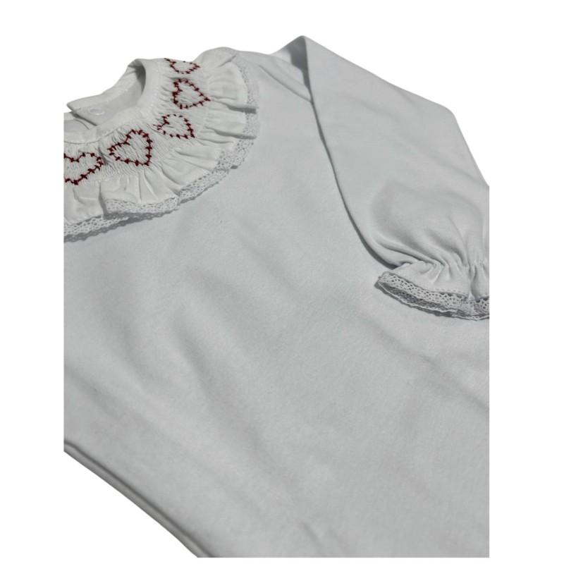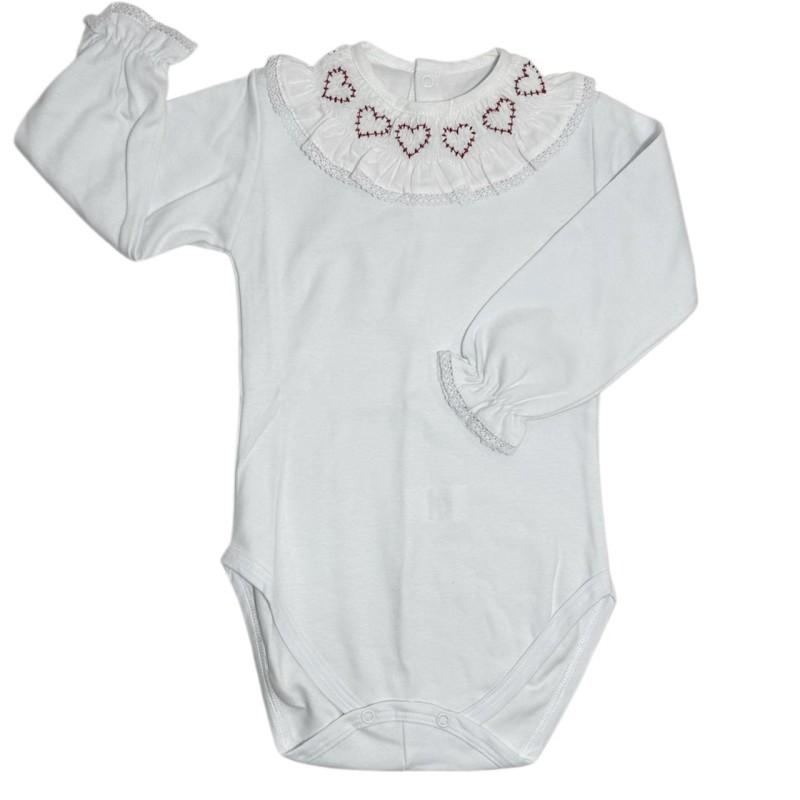 Encante-se com este delicado body infantil manga longa, perfeito para deixar sua bebê confortável e ainda mais charmosa. Em cor branca, o modelo apresenta uma gola babador com lindos bordados de corações em vermelho, trazendo um toque romântico e elegante ao visual.