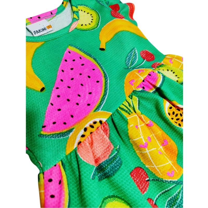Estampa temática de frutas bem vibrante, com melancia, abacaxi, banana, kiwi, cereja e mais — tudo em cores fortes e chamativas.