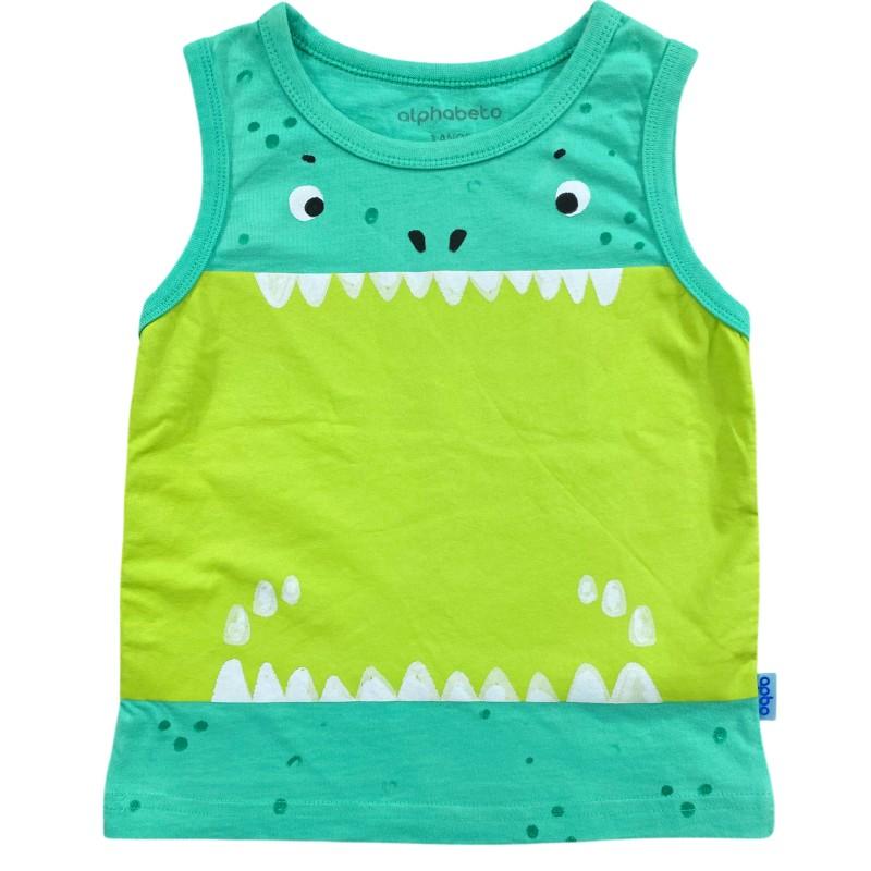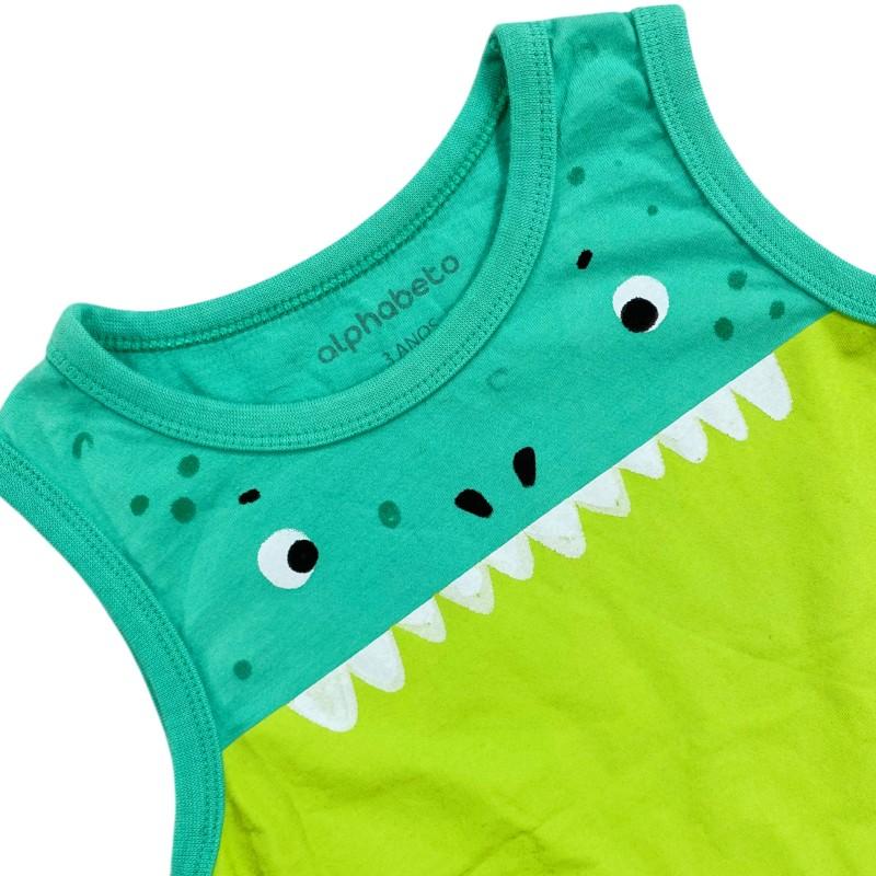 A peça traz uma estampa fofa e criativa de dinossauro, com dentes e olhinhos que deixam o look super divertido e alegre. Confeccionada em malha de algodão macia e respirável, é perfeita para os dias quentes, garantindo conforto e liberdade nos movimentos.