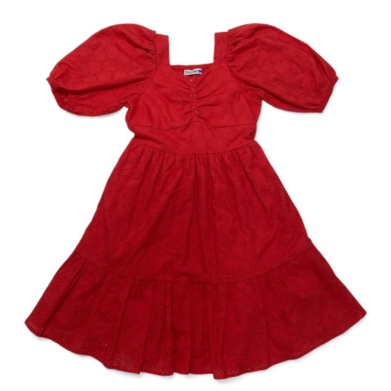 Vestido vibrante na cor vermelha, confeccionado em tecido laise (bordado inglês). O design destaca-se pelo decote quadrado e as modernas mangas bufantes (puff sleeves), que conferem um charme romântico e retrô. Possui cintura marcada e saia evasê em camadas. É uma peça perfeita para eventos diurnos, festas e ocasiões especiais, unindo estilo e frescor.