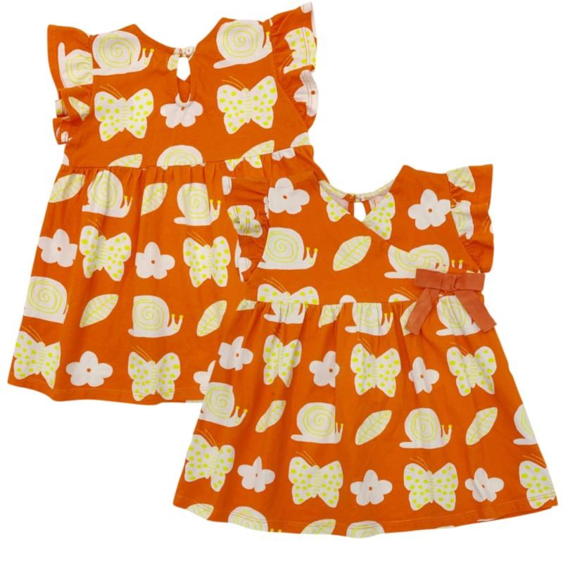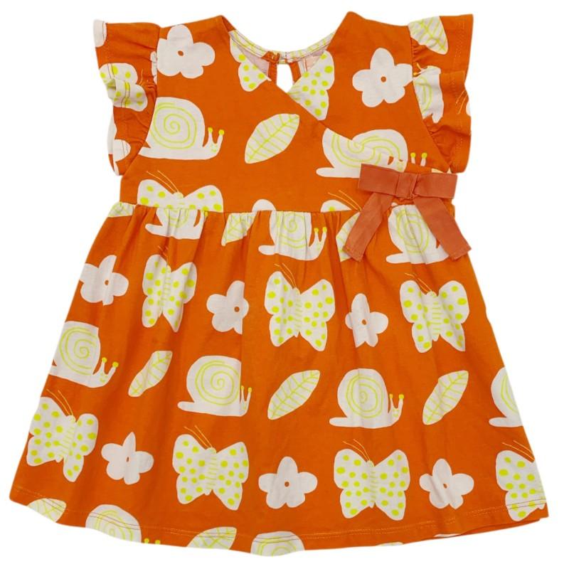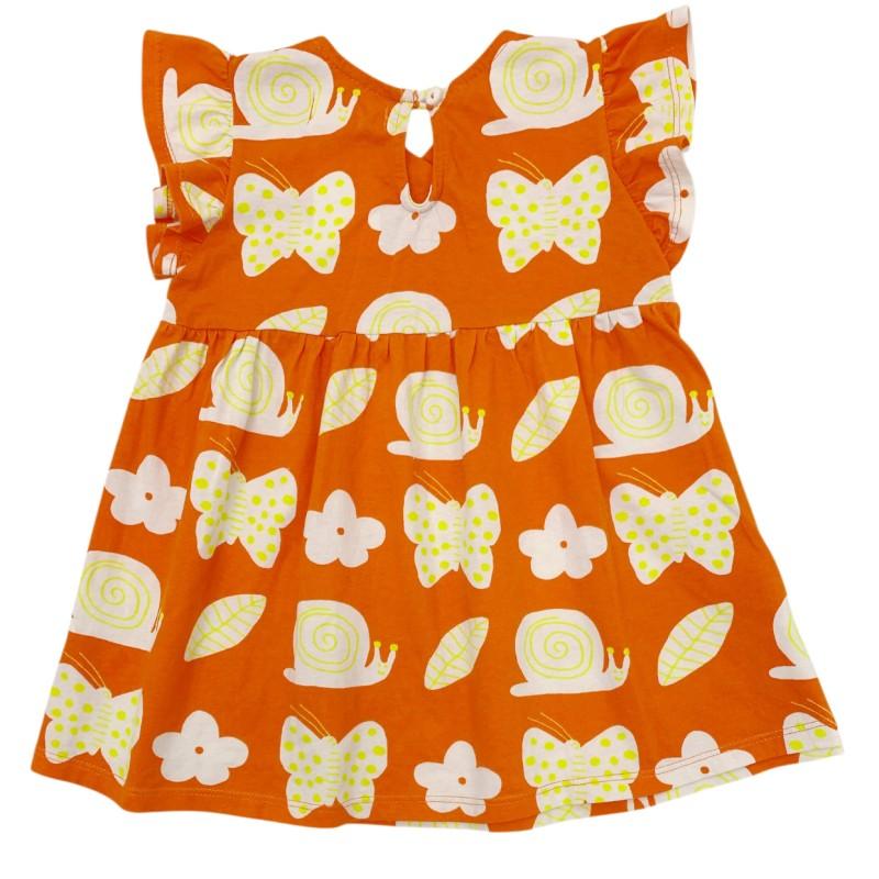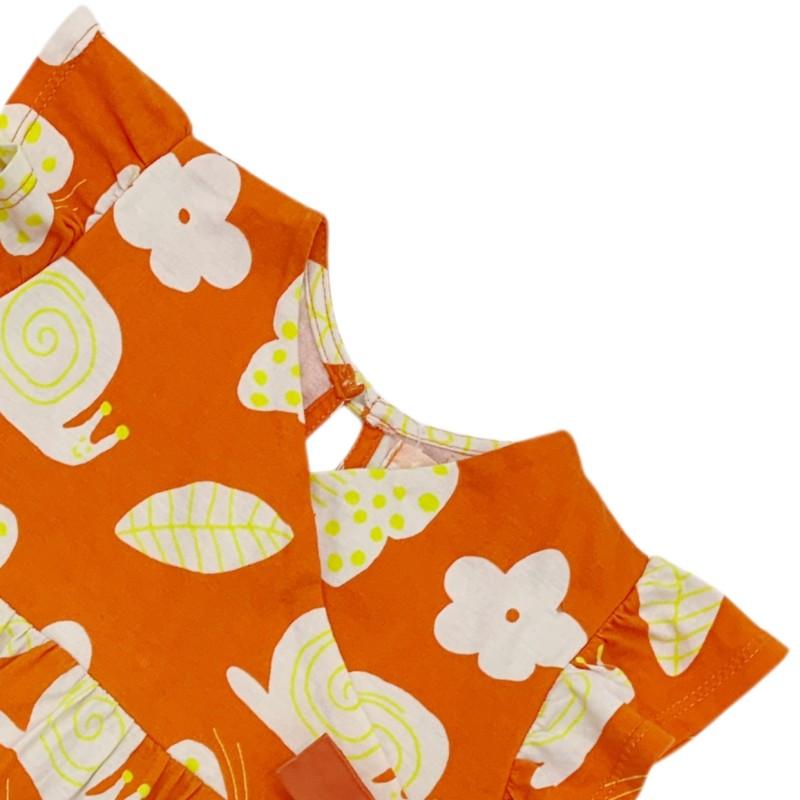 Laranja Estampa Caramujo. Confeccionado em malha macia e confortável, este vestido é perfeito para as aventuras diárias. A estampa exclusiva de caramujos sobre o fundo laranja vibrante adiciona um toque divertido e delicado, ideal para bebês cheios de curiosidade que amam explorar a natureza. O design inclui babados nas mangas e um decote em U para maior charme e liberdade de movimentos.