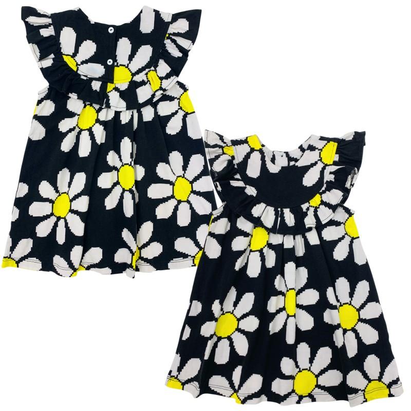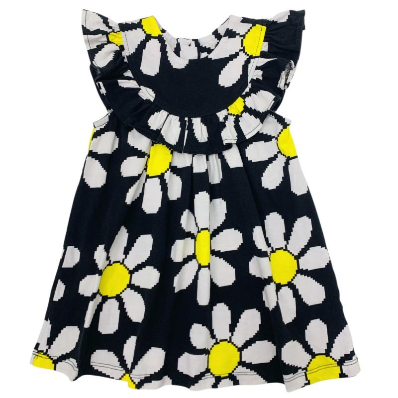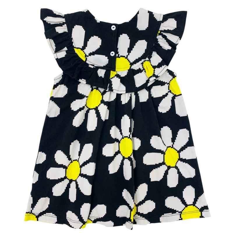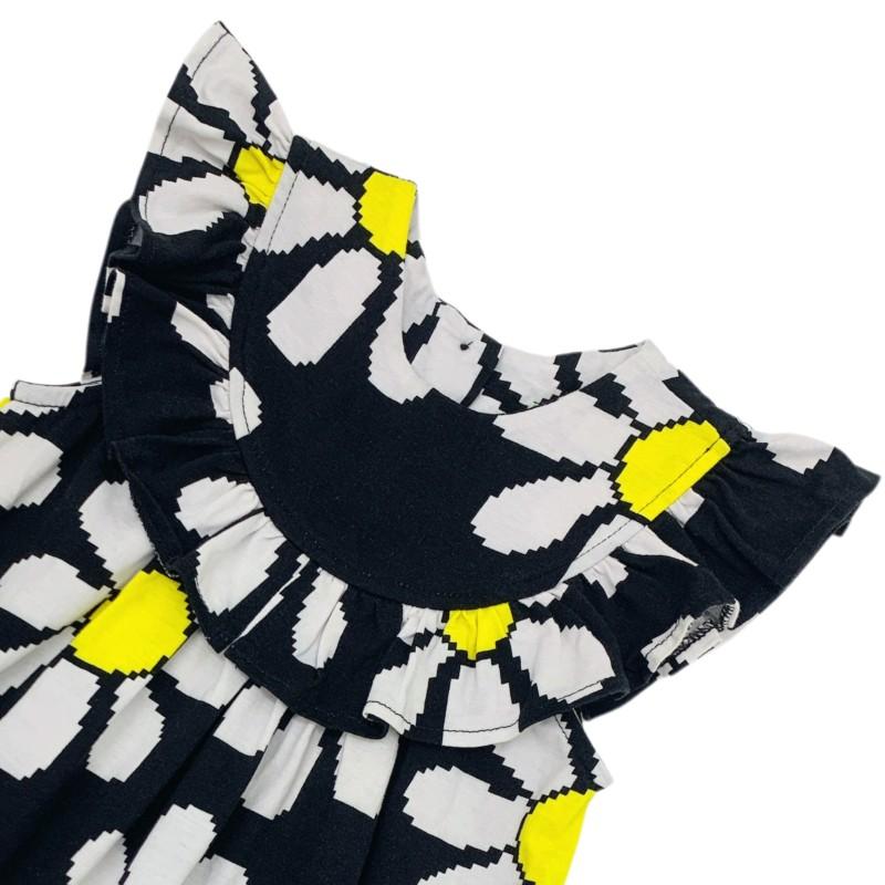 O padrão marcante é de grandes margaridas pixeladas em branco com miolos amarelos sobre um fundo preto. Esse estilo gráfico remete à estética de jogos de videogame antigos, um toque moderno e divertido. O modelo possui um corte solto e alças com babados, um detalhe que confere delicadeza à peça.