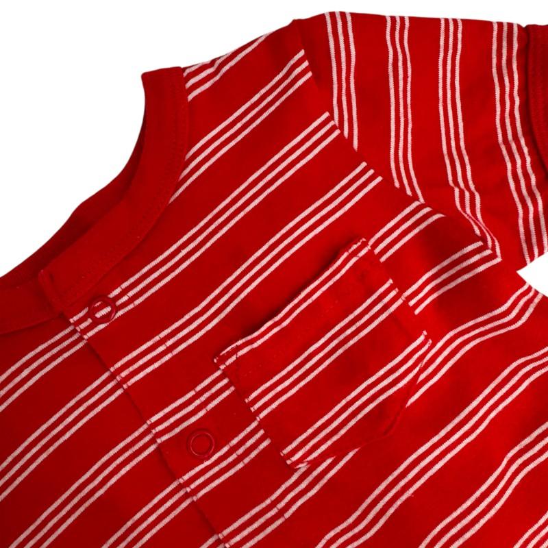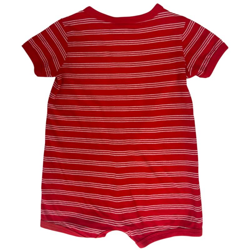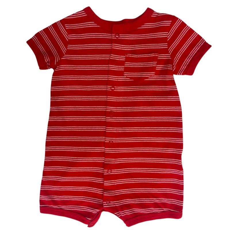 Romper listrado feito de algodão com bolso e botões frontais da Carter’s sem marcas de uso. Combina estilo e praticidade pros dias mais quentes.
