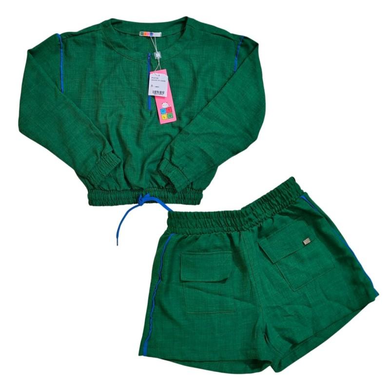 Conjunto feminino em tom verde, composto por blusa cropped de manga longa com elástico na barra e shorts com cintura elástica. Possui detalhes em vivo azul que dão um toque moderno à peça. Confortável e estiloso, ideal para looks casuais do dia a dia.