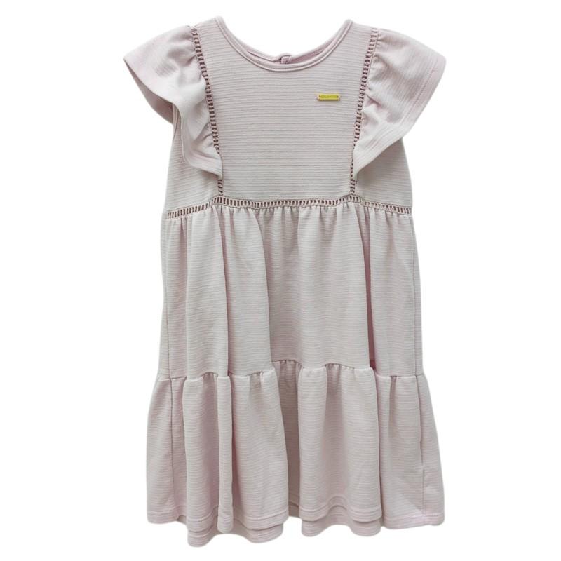 Vestido infantil da Coloritta em tecido canelado macio, na cor rosa claro. O modelo possui mangas curtinhas com leve babado, trazendo um toque delicado. A parte superior é ajustada, com detalhes de acabamento vazado nas costuras, que adicionam charme ao visual. A saia conta com camadas franzidas, criando um efeito rodado e muito feminino. Possui plaquinha metálica decorativa da marca na frente. É uma peça confortável, estilosa e perfeita para o dia a dia ou ocasiões casuais.