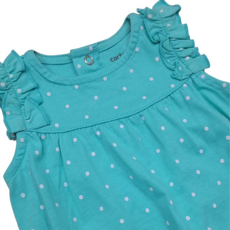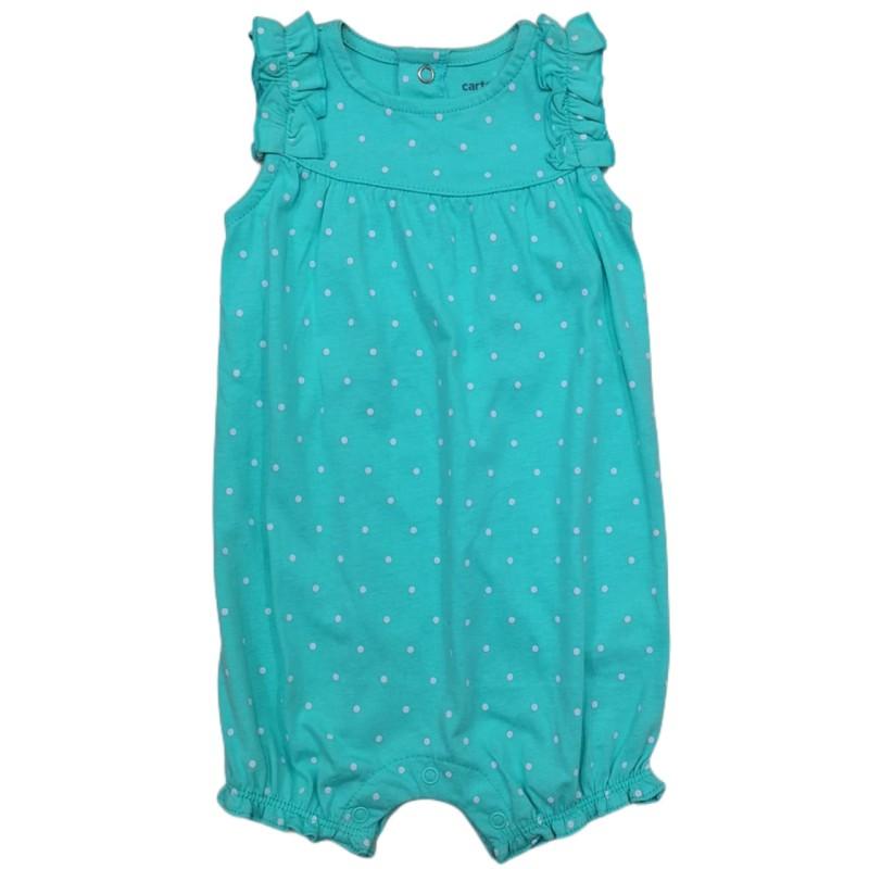 Macacão Curto Romper 09 meses da marca Carter’s em algodão, corte mais curto, ideal para clima mais quente ou para sobreposição, com fechamento tipo snap-up (pressionar), com detalhes em babadinho nas pernas e ombros.