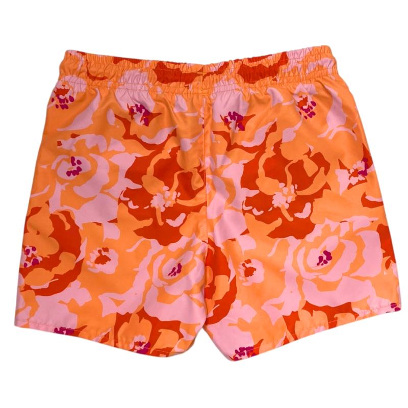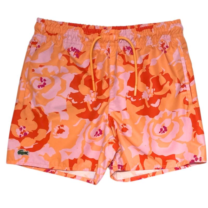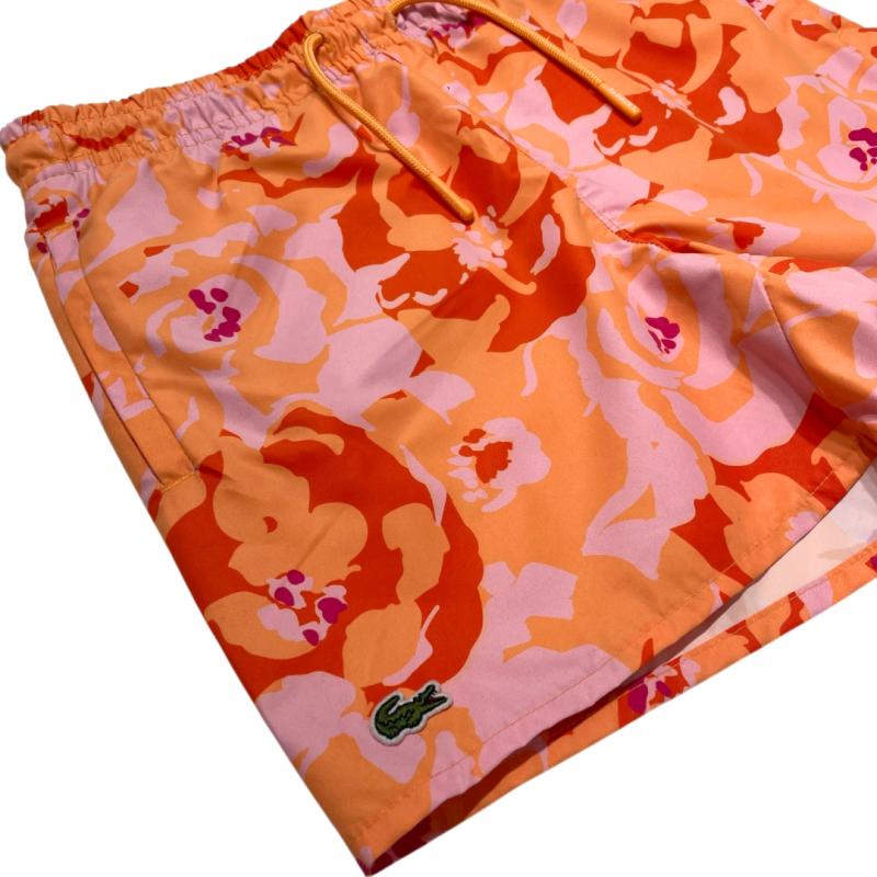 Bermuda da marca Lacoste na cor laranja e verde com ornamentos na estampa, de tactel com bolso e cordão de ajuste na cintura.