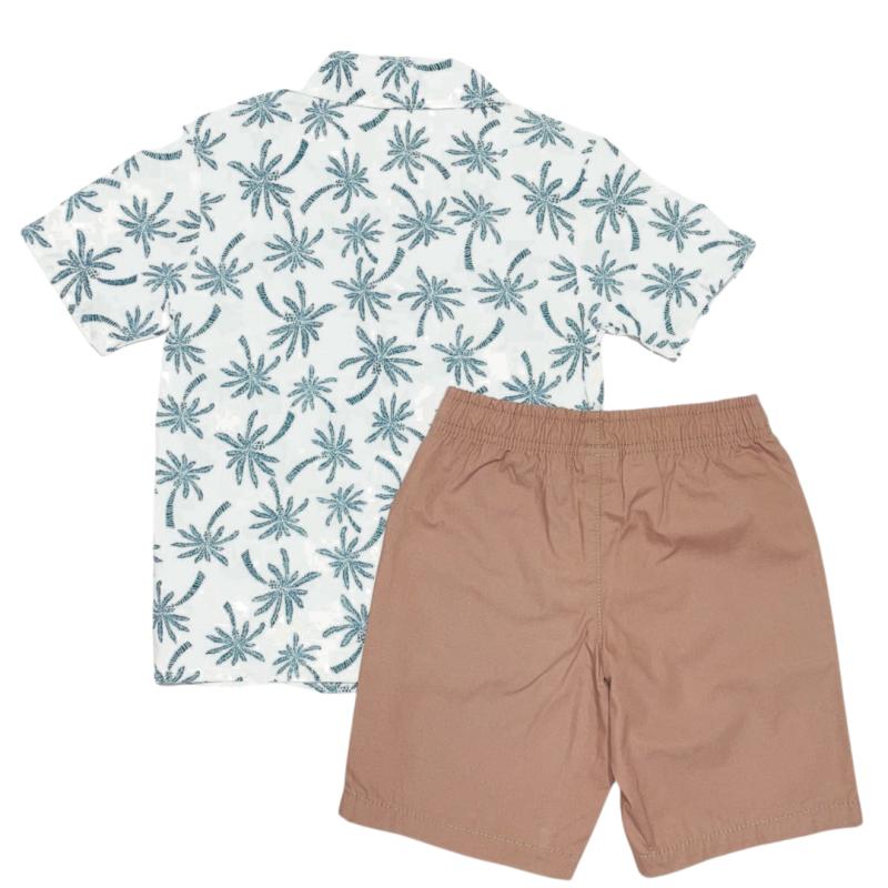 Camisa com fundo branco e estampa de coqueiros na cor azul, com botões de madeira, bermuda na cor marrom super confortável com bolsos e elástico na cintura.