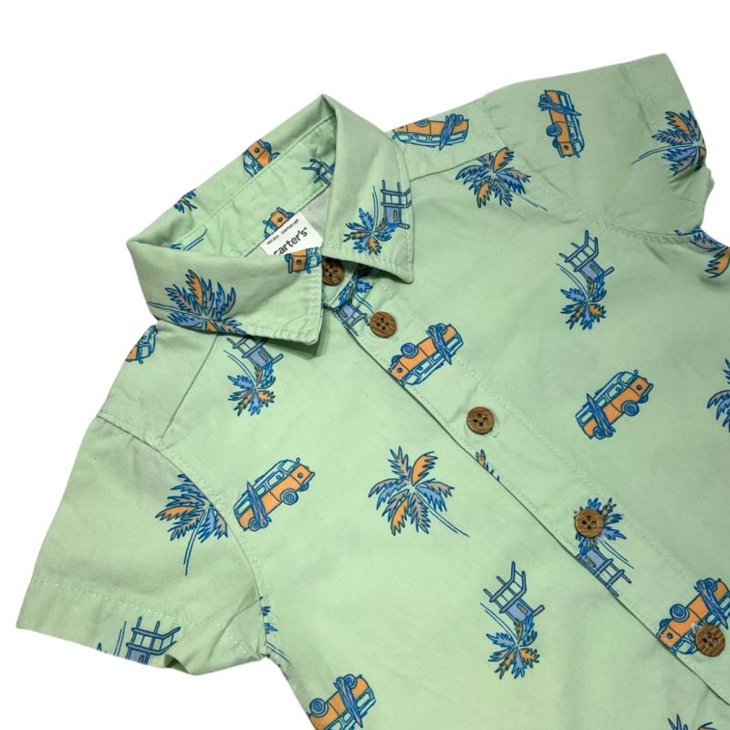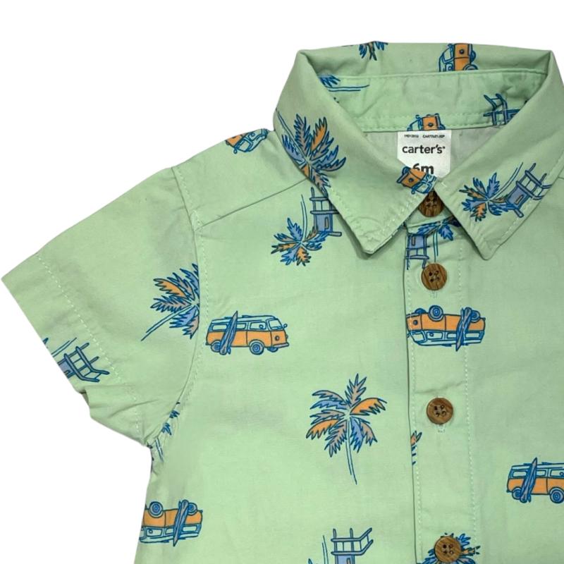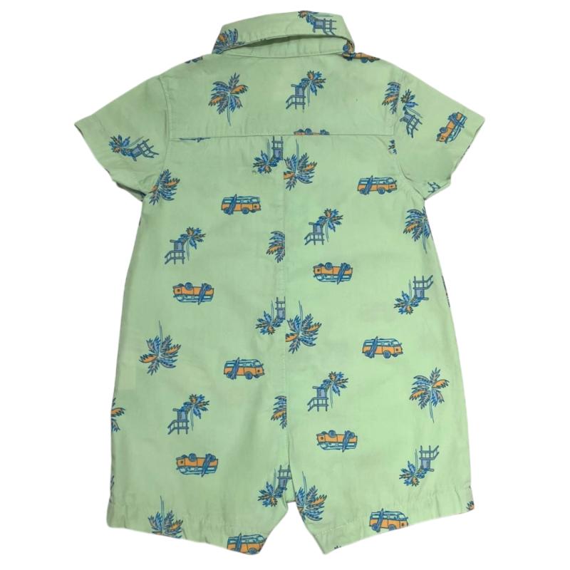Macaquinho com estampa de kombi e palmeiras, na cor verde, fecho de pressão embaixo e na frente botões de madeira, ótimo para seu pequeno passear no verão!!