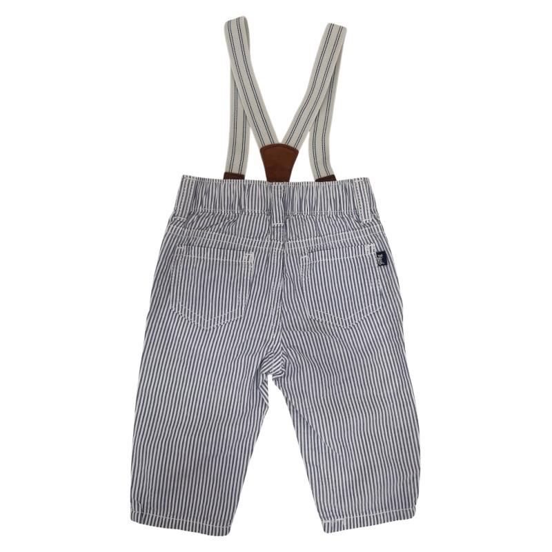 Calça de algodão listrada com suspensório ajustáveis cós elástico na parte de trás e bolsos funcionais.