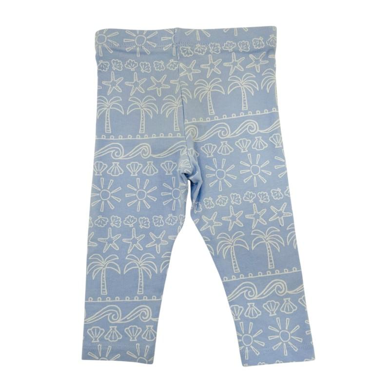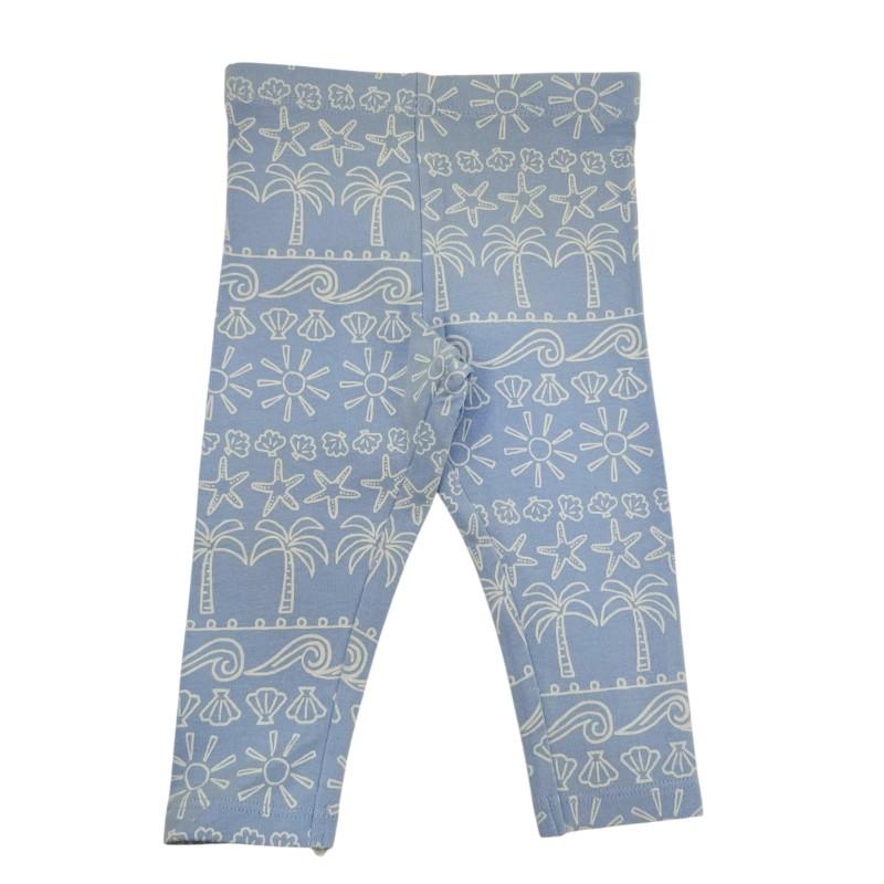 Calça legging com elastano 57% algodão azul bebê com detalhes na estamparia em branco de tema praia 3 a 6 meses