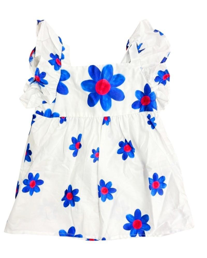 Vestido desenvolvido em tecido 100% algodão com forro para bebês. A roupa vem com decote quadrado, babado nas alças, saia rodada, recorte com abotoamento nas costas e calcinha combinando com os desenhos da estampa.