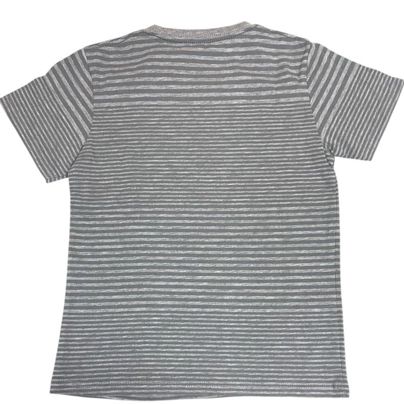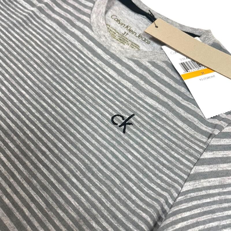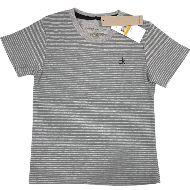 Camiseta listrada Calvin Klein cinza na etiqueta. Tamanho 3 anos. 60% algodão, 40% poliéster.