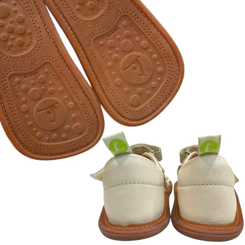 Sandália branca em couro macio, com solado flexível e fechamento em velcro. Tamanho 18.